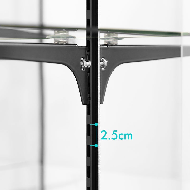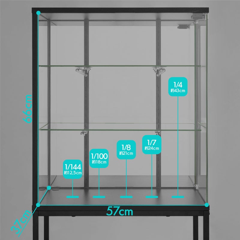 棚板は2.5cm単位で高さを調節できる仕様です。取り外すこともできるため、高さ66cmまでの1/4スケールフィギュアや海外製の大型トイなど、様々なサイズのコレクションを美しく収めることができます。お気に入りのフィギュアに合わせた、ベストな見せ方を追求してください。