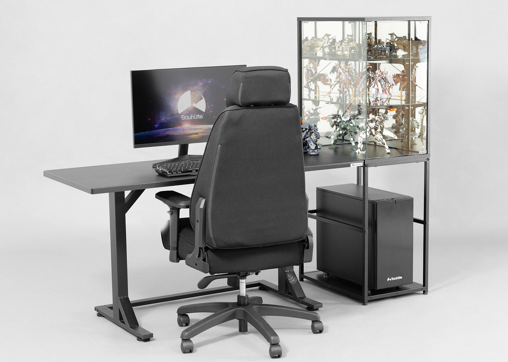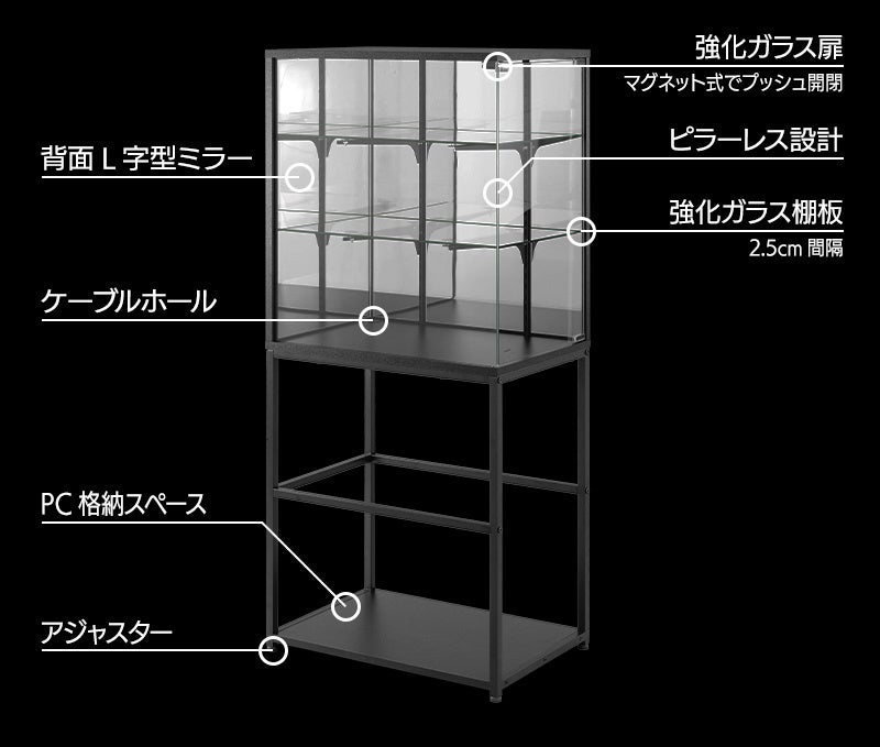 本製品は、そんなコレクターの想いに応えるべく、デスク横に設置して、大切なコレクションをいつでも眺められる専用ラックです。ガラス製のフルクローズ設計に加えて背面を映し出すミラーを配しており、中に入れた物をホコリから守りつつも、美しく飾って置ける仕様。利便性にも考慮し、ラック下部にはゲーミングPCが収まる収納スペースを確保しています。デスクのすぐそばという、いつでも目に入る場所を"フィギュアの特等席"へとグレードアップしてみませんか?