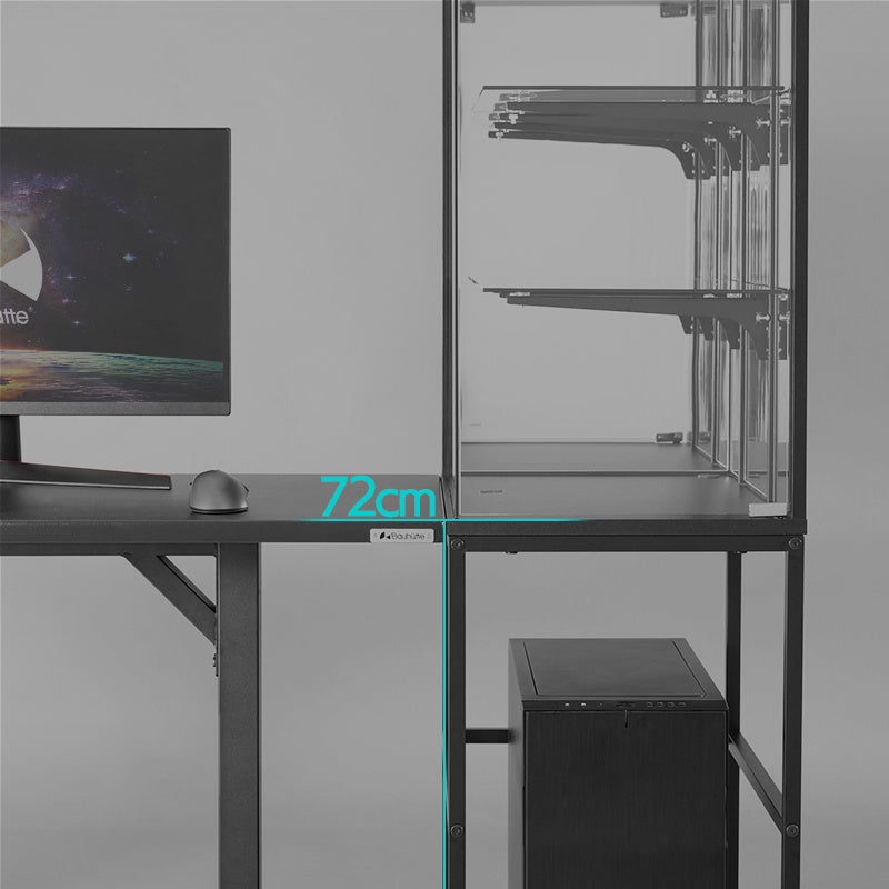 一般的なデスク(高さ72cm)と高さを揃えて設計。デスクの延長としてシームレスに配置でき、作業中もお気に入りのフィギュアを常に視界に入れておくことができます。さらに、ラック下部にはゲーミングPCを格納できるスペースを確保。ディスプレイと収納を両立し、デスクサイドの空間を最大限に有効活用できます。