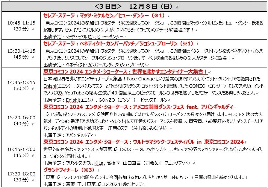 株式会社東京コミックコンベンション(代表取締役社長:後藤 武彦)は、2024年12月6日(金)~12月8日(日)までの3日間、幕張メッセ(千葉市美浜区)にて開催する「東京コミックコンベンション2024」(以下、「東京コミコン2024」)のステージスケジュール情報と来日セレブ情報を発表いたしました。