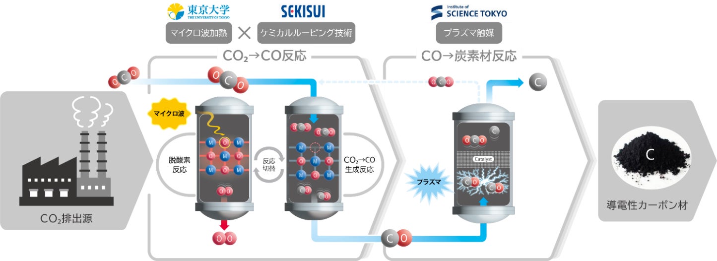 積水化学工業株式会社(代表取締役社長:加藤敬太、以下「積水化学」)、国立大学法人東京大学(総長:藤井 輝夫、以下「東京大学」)、国立大学法人東京科学大学(理事長:大竹 尚登、以下「東京科学大学」)は、NEDO(国立研究開発法人新エネルギー‧産業技術総合開発機構)の委託事業「カーボンリサイクル・次世代火力発電等技術開発/CO₂有効利用拠点における技術開発/研究拠点におけるCO₂有効利用技術開発」に共同で応募し、「水素不使用高エネルギー効率CO₂由来導電性カーボン材大規模製造技術の研究開発」の実施先として採択されました。