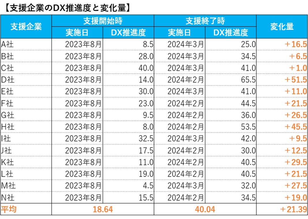 本事業では、今回支援した14社の企業の変化を定量的に測定するために、DX診断を活用した定量的な目標値を設定しました。その結果、DX推進度と変化量について、目標値を大きく上回る成果が得られ、支援企業にとっては短期間で大きな変化を実現することができました。さらに、支援企業以外にも活用できる熊本市内企業専用のデータベース( https://kumamotocity-dx.jp/ )には、合計36社のデータが蓄積され、DXに対する興味関心が高い企業の課題を把握することができました。