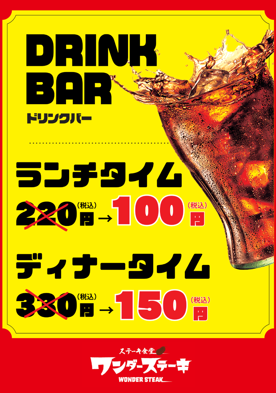 目玉商品 : 閉店大特価セール「とろけるハラミカットステーキセット」&「ドリンクバー」