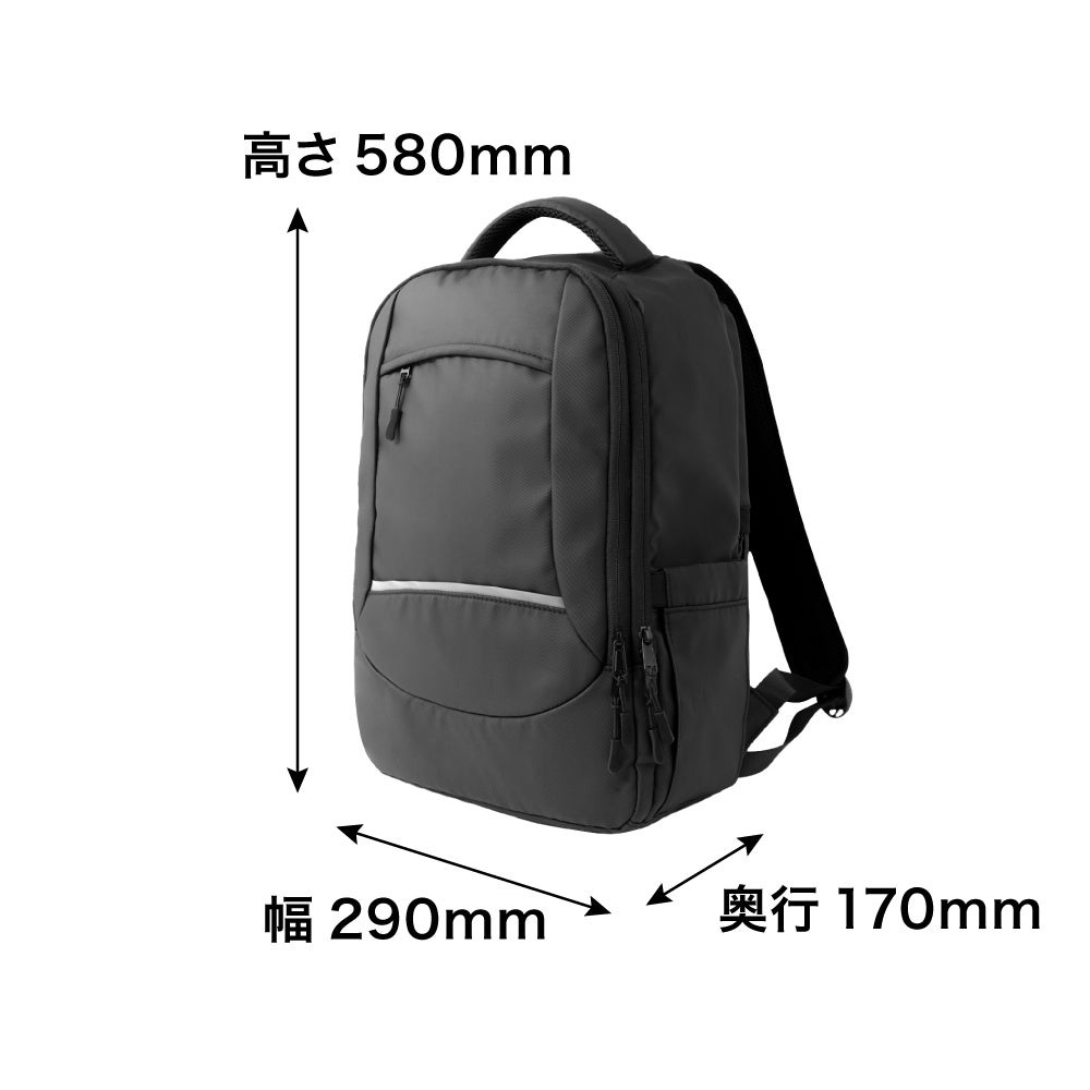 正面にポケット1か所,内側にポケット4か所、側面にボトルホルダー2か所搭載。16インチサイズのノートパソコンも収納できます。