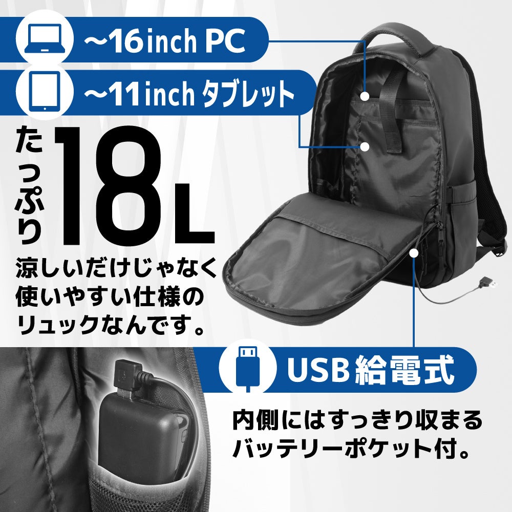 本製品は扇風機を内蔵し内側から風が出るリュックサックです。