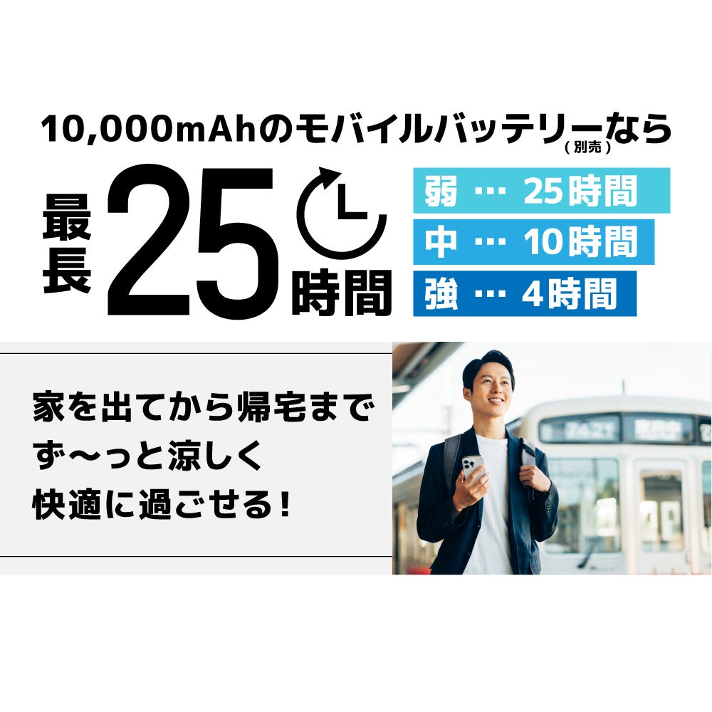 モバイルバッテリーで使えるUSB給電式で、10000mAHのバッテリー使用時は強4約時間、中約10時間、弱約25時間可能。モバイルバッテリーは内部のポケットに収納できます。