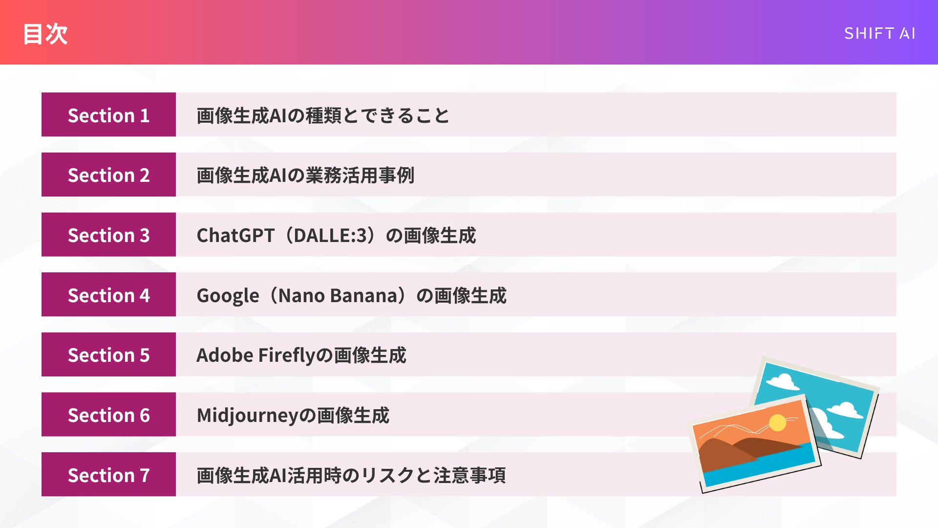 「日本をAI先進国に」を掲げ、AIのビジネス活用を学べる利用者数No.1※のAI学習プラットフォーム「SHIFT AI」を運営する株式会社SHIFT AI(東京都渋谷区、代表取締役 木内翔大、以下 当社)は、法人向けリスキリングサービス「SHIFT AI for Biz」のeラーニングプラットフォームにて、AIによる画像生成の基礎理論から実務応用までを体系的に学べる「画像生成AIコース」を2025年10月31日より提供開始します。