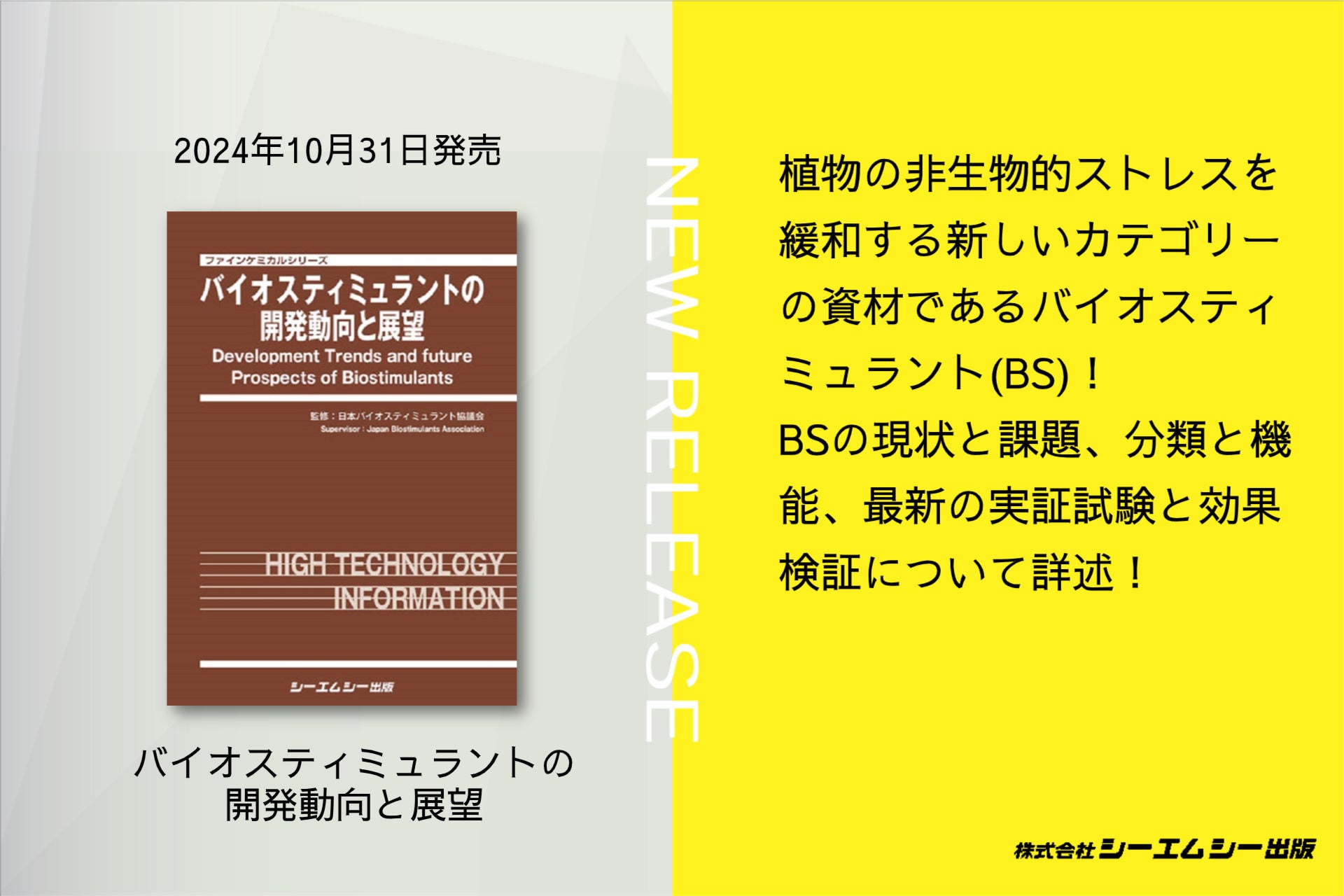株式会社シーエムシー出版(本社:東京都千代田区神田錦町1-17-1、代表取締役:辻賢司)は、バイオスティミュラント(BS)の現状と課題、分類と機能、最新の実証試験と効果検証について詳述した書籍『バイオスティミュラントの開発動向と展望(監修:日本バイオスティミュラント協議会)』(定価:税込80,300円)を、2024年10月31日に発売いたします。本書籍は、当社ECサイトおよび全国の書店にてご購入いただけます。