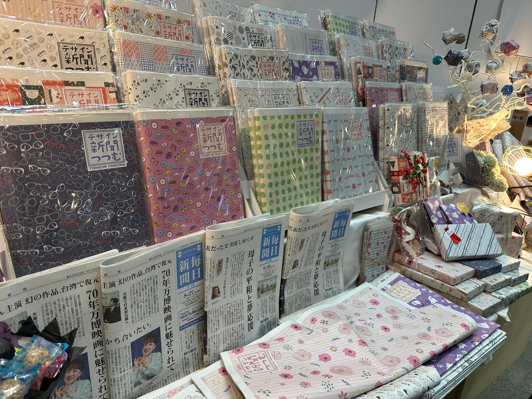 メインとなるのは、ポップでかわいいデザインが特長のデザイン新聞「つつむ」です。新聞一枚分のサイズを活かし、広げた瞬間に楽しさが伝わる紙ものとして、ギフト包装はもちろん、ブックカバーや工作素材など、さまざまな用途でお使いいただけます。今回は、春夏向けの明るく軽やかなデザインを多数ご用意しました。