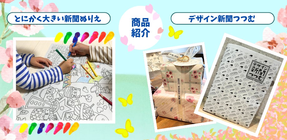 「つつむ」は、思わず選びたくなるデザインバリエーションを多数展開。ラッピングはもちろん、ブックカバーや工作など、使い方は自由です。「とにかく大きい新聞ぬりえ」は、「思いきり、のびのび描いてほしい」という想いから、新聞を広げたときと同じくらいの大きさでご用意しました。子どもから大人まで、新聞サイズならではのダイナミックさを楽しんでいただけます。