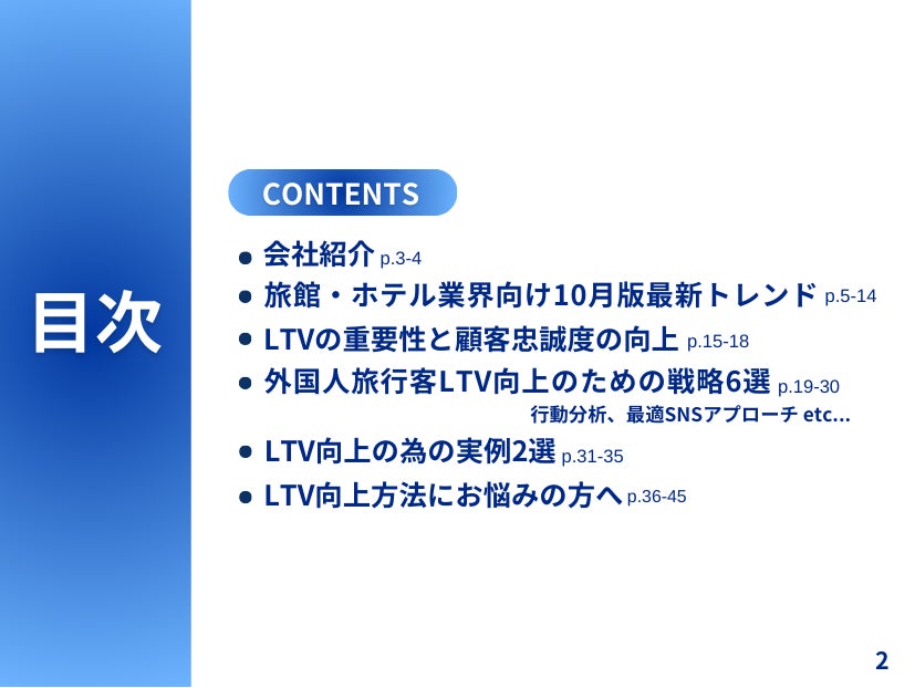 株式会社ベクトル(本社:東京都港区、代表取締役会長兼社長:西江 肇司、東証プライム:6058)の子会社であるOwned株式会社(東京都品川区、代表取締役社長、石井翔、以下「当社」)は、「旅館・ホテル業界向け|外国人旅行客のLTV最大化戦略をまとめた最新トレンド・事例紹介レポート」2024年10月版(全45ページ)を無料公開いたしました。