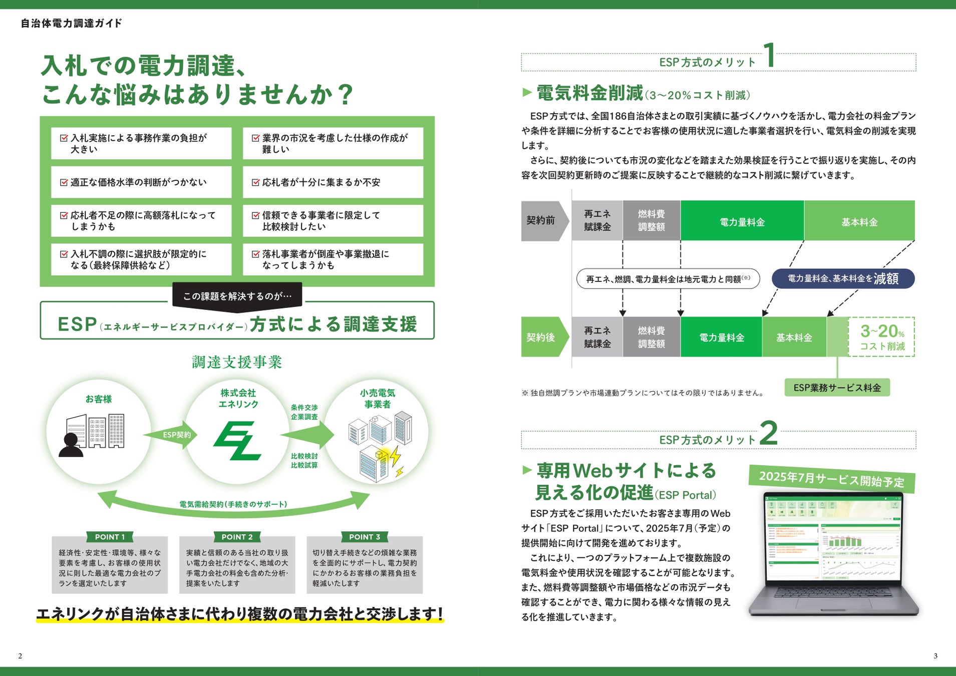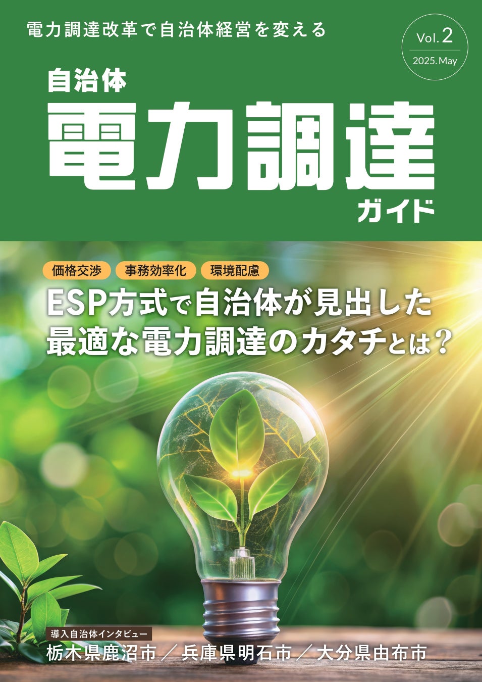 今回のVol.2では、ESP方式を既に導入している栃木県鹿沼市、兵庫県明石市、大分県由布市の担当者へのインタビューを掲載。各自治体がESP方式を通じて見出した最適な電力調達の形と、その導入プロセスや実際に得られた効果などを具体的に紹介しています。