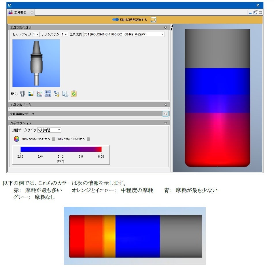 新しい「ヒートマップ」表示を使用して、工具の摩耗パターンを確認できます。色とメッセージの組み合わせで各工具の使用状況や、切削が工具に与えた影響を確認出来ます。