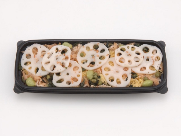 発芽玄米を使用した酢飯に刻み沢庵と生姜を混ぜ込みました。青しそ高菜や錦糸玉子、刻み揚げ、枝豆をちらし、花火に見立てた酢蓮根をトッピング。