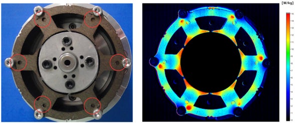 下図の測定事例では、損失分布図の赤丸部分に積層鉄心の積層を固定する溶接が施してあり、その影響で透磁率が低下し、ティース両脇に磁束が集中し損失が高くなっていることがわかります。