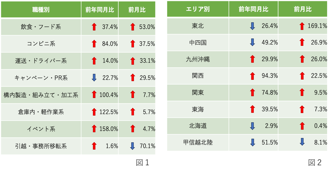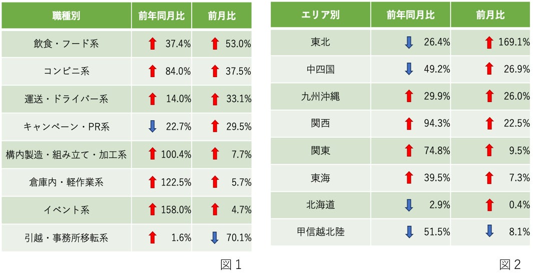 前年同月比で最も増加率が大きかったのは「イベント系」で、+158.0%となっており、ついで「倉庫内・軽作業系」、「構内構造・組み立て・加工系」となっています。