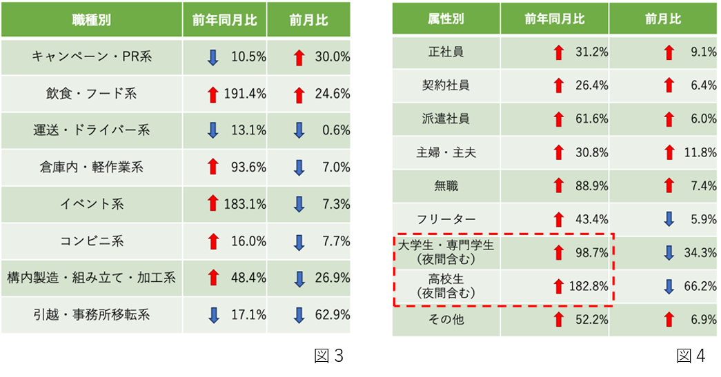 前年同月比では、どの属性においても応募数は増加しています。4月の特徴としては、イベント系求人に学生の応募が多く入ったことから、前年同月比では学生の応募数が大きく増加しています。(2022年4月現在)※図4