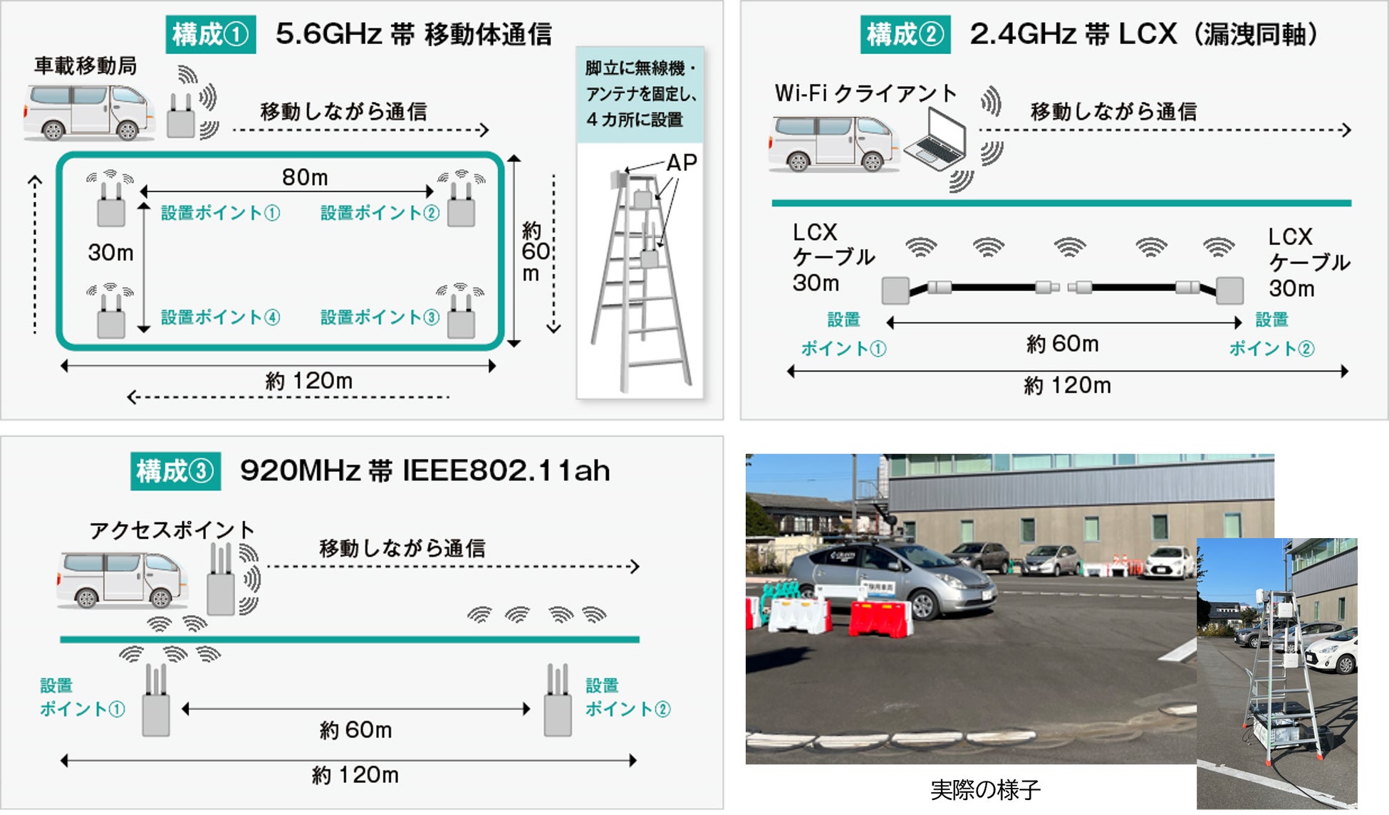 今回の実証実験ではトンネルや山間部などの通信不良環境を想定し、周波数帯などが異なる以下3種類の通信方式にて検証を行いました。