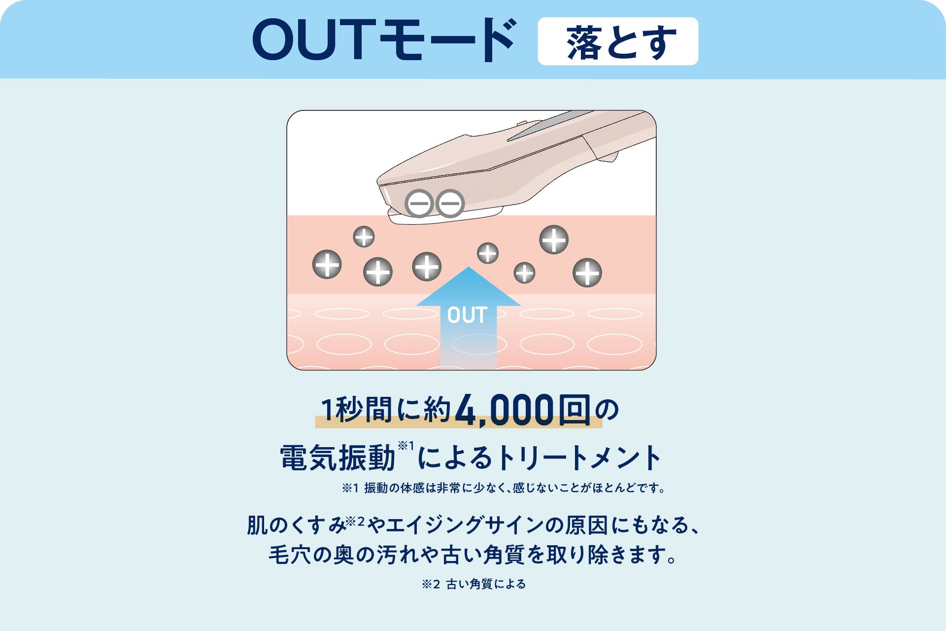 肌の汚れを落とすOUTモードと、うるおいを届ける※1 INモードを搭載しており、電気振動※2によるトリートメントでクレンジングや洗顔で落としきれない汚れをオフし、化粧水や美容液の浸透※1をサポートします。肌のざらつきやくすみ※3、乾燥が気になる方におすすめです。