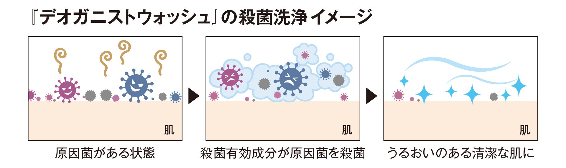 殺菌有効成分配合の泡で菌を洗い流し、清潔な肌を保ちながらニオイの発生を抑えます。