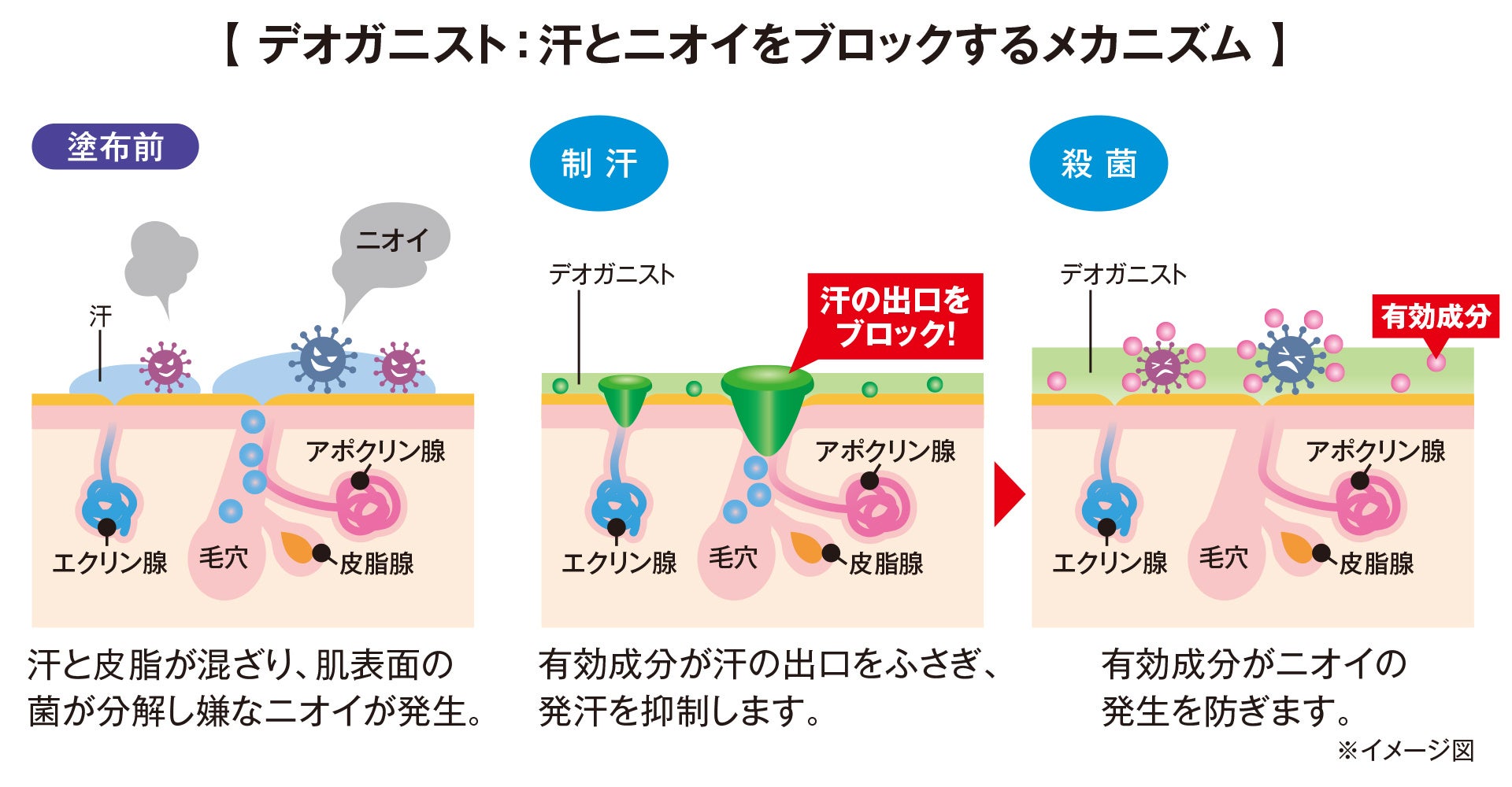 デオガニストは制汗と殺菌、2つの有効成分でワキのニオイを防ぎます。