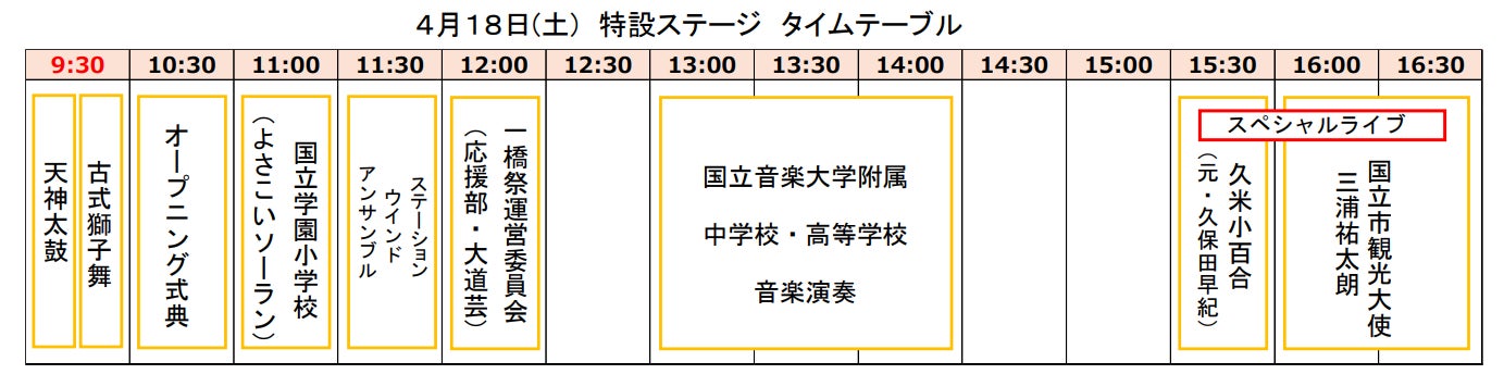 【4月18日(土)】特設ステージにおいて記念式典を実施するほか、国立市にゆかりのある著名人によるコンサート、近隣学校の学生による歌や踊り等のパフォーマンスを披露します。また、現役の駅社員と元駅社員で構成された管楽器アンサンブル「ステーション・ウインド・アンサンブル」(下記参照)も出演します。