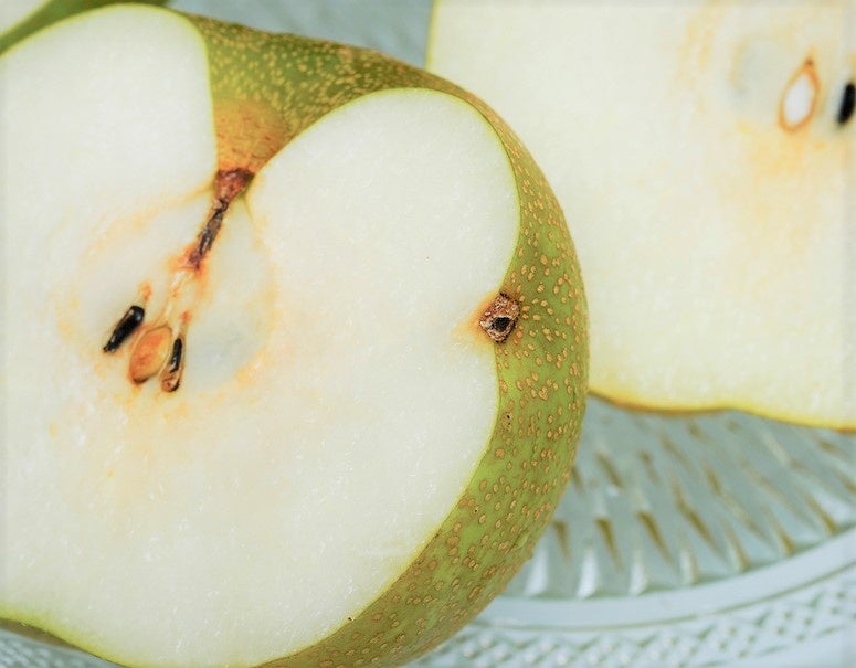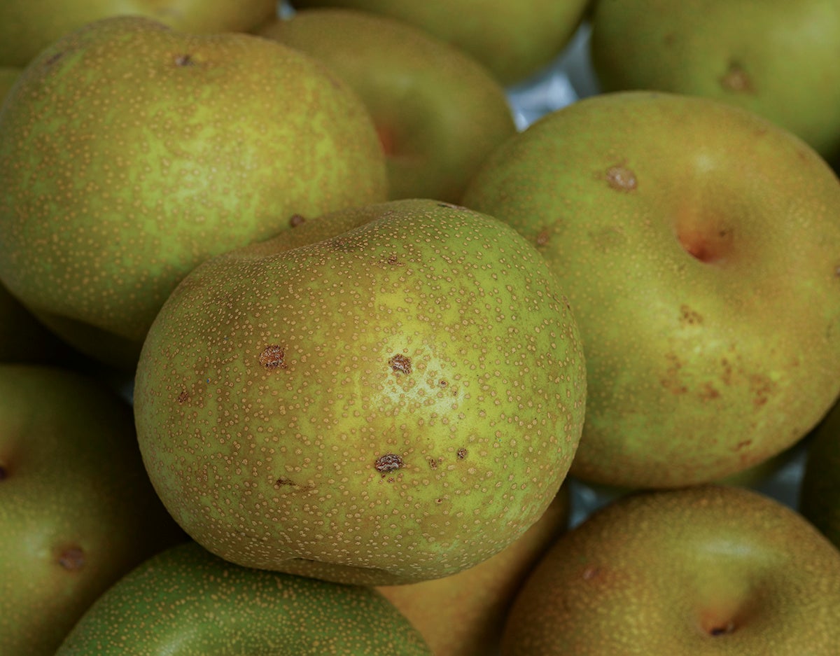 農家の収入を少しでも高めるため、JAいちかわでは「雹等級」を新たに設け、生食向けに出荷することにしました。豊洲市場ドットコムで扱うのは、この市川梨の「雹等級」です。皮をむく際にコルク部分を取り除けば、通常の梨と味も食感も変わりません。