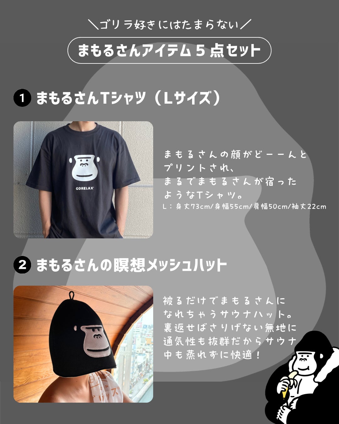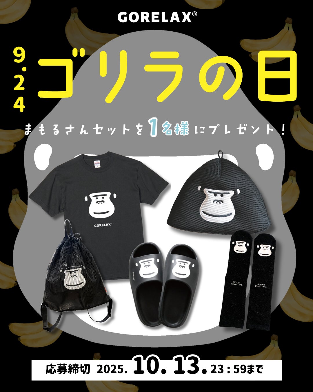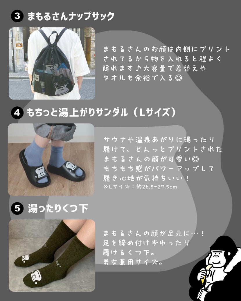 ごリラックスのオンラインショップでも大人気のまもるさんの顔がデザインされたアイテムたちが豪華セットとなって抽選で1名様にプレゼント!同じく公式インスタグラムにてキャンペーンを告知。