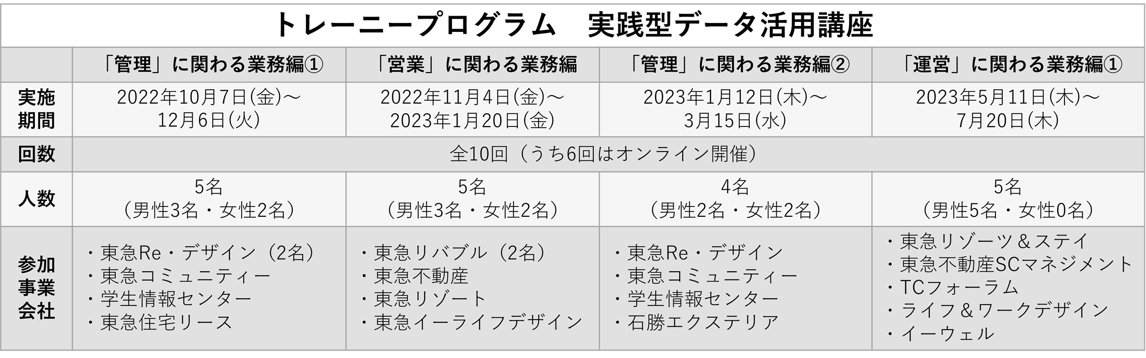 Plus W株式会社(本社:東京都渋谷区、代表取締役社長:櫻井稚子、以下「Plus W」)のサポートのもと、2022年10月〜2023年7月の期間に計4回、東急不動産ホールディングスグループより候補人材を募り、実践型トレーニープログラムを実施することで、ビジネスとデジタルをつなぐ「ブリッジパーソン」を計19名育成いたしました。本プログラムを実施することで、今後、社内のDXを加速させ、長期的な「成果」に繋がるDXプロジェクトをグループ各社で推進してまいります。