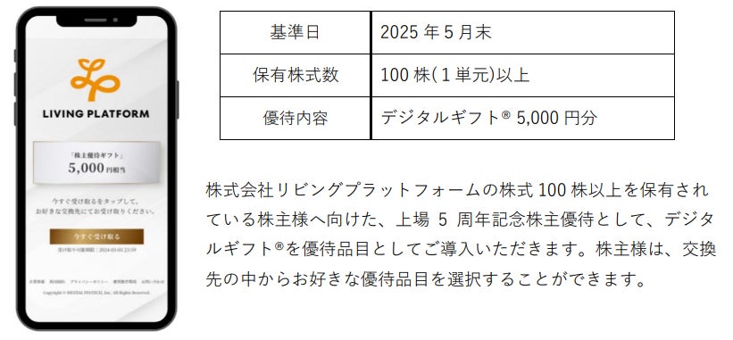株式会社リビングプラットフォーム(代表取締役:金子 洋文、東証グロース市場:証券コード7091)において、株式会社デジタルプラス(代表取締役社長:菊池 誠晃、本社:東京都渋谷区、東証グロース市場:証券コード3691)の子会社である、株式会社デジタルフィンテック(代表取締役社長:菊池 誠晃、本社:北海道札幌市)が運営する「デジタルギフト®」を上場5周年記念株主優待としてご活用いただくことになりました。