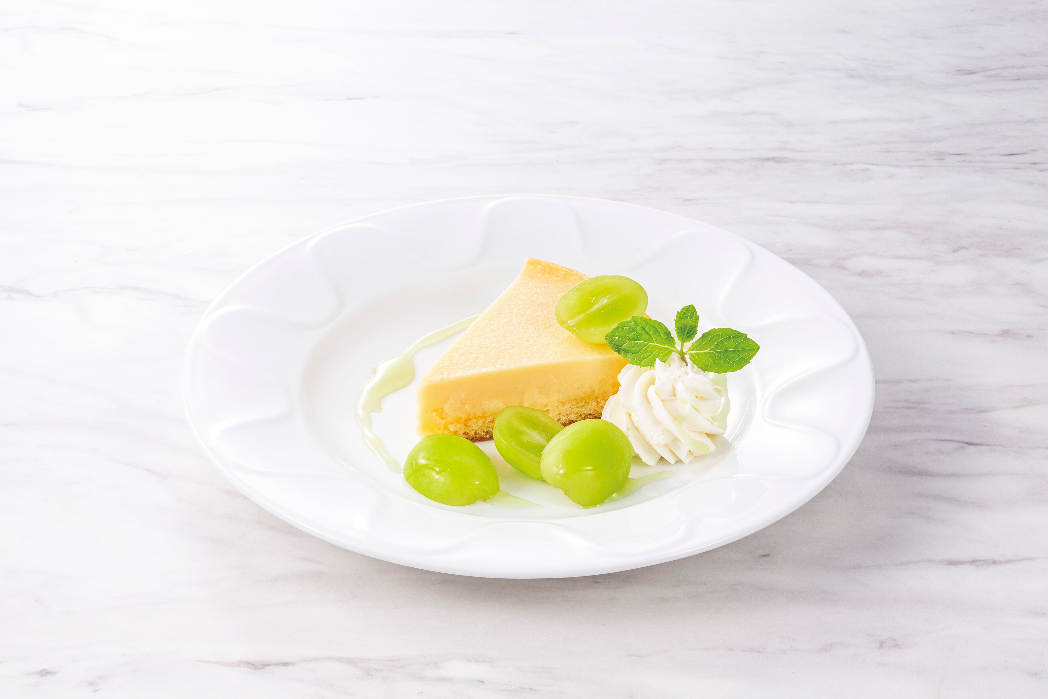 しっとりなめらかな口当たりと、爽やかな酸味に際立つチーズのコクが特長のチーズケーキにみずみずしいシャインマスカットを添えました。