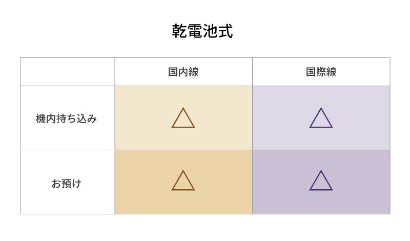 アルカリ乾電池、マンガン乾電池を使用したヘアアイロンも乾電池を外した状態であれば持ち込み、お預けともに可能。取り外した乾電池は+と−の電極部分が他の電池や金属類に接触しないように専用ケースに入れる、ビニールテープで保護するなど、絶縁対策が必要です。