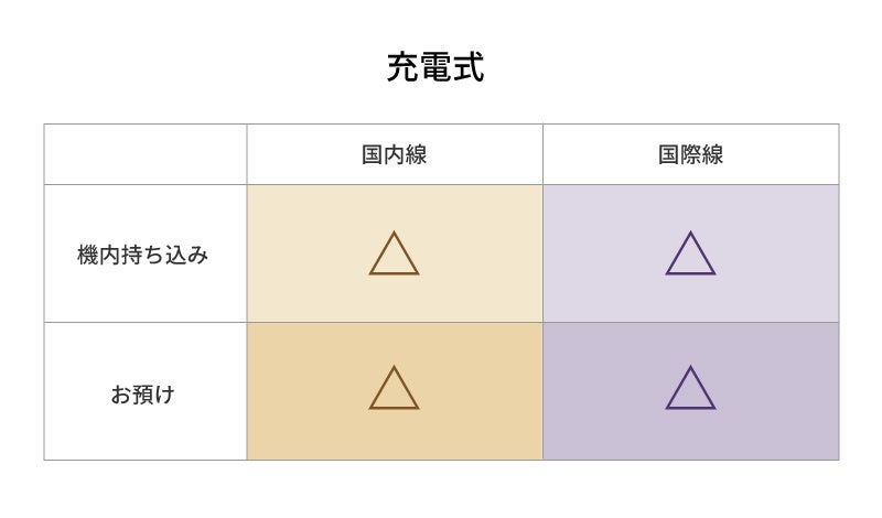 プラグをコンセントに差して使用するコンセント式は個数制限なしで機内への持ち込みも、預け入れも可能。ただし、海外の場合は電圧、コンセントの種類が異なるため、海外対応タイプもしくは変圧器・プラグアダプターを併用してください。