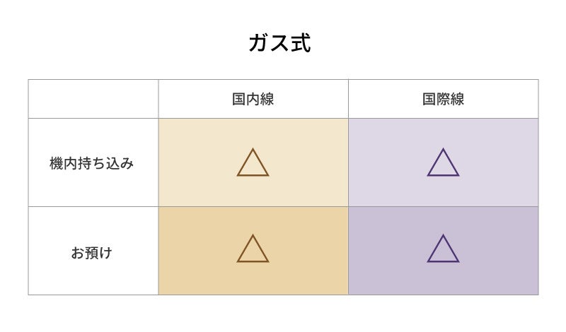 炭化水素ガスを使用したガス式は持ち込み、お預けともに可能ですが1人1個までの個数制限があります。またアイロン部分に安全カバーが付いたものが条件となり、予備のガスカートリッジの持ち込み、お預けはNG!