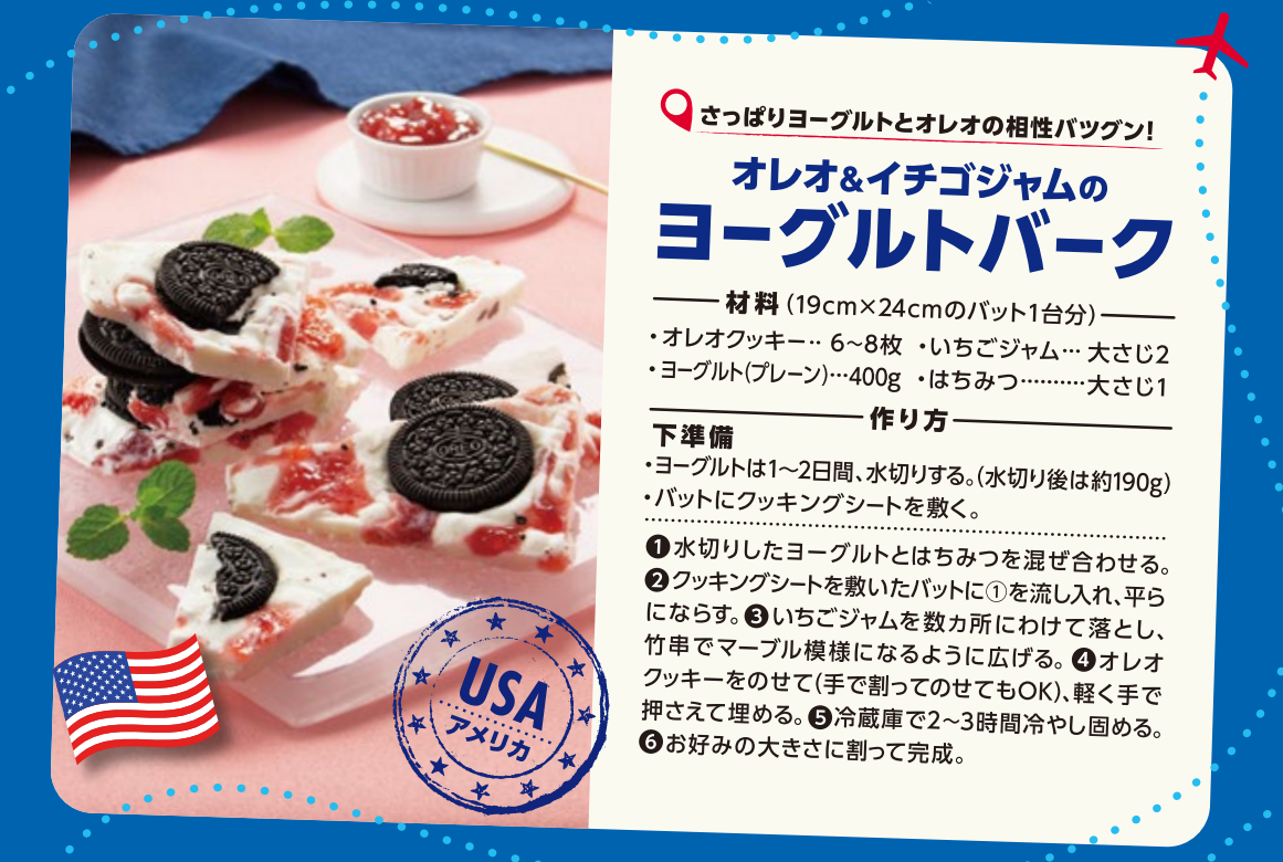 今回のレシピは、世界5か国から集められた見た目も涼しげなものばかり。暑い日々でも、爽やかな気分にしてくれる冷たいスイーツが集結しました。メキシコからは、材料を混ぜて冷やし固めるだけなので失敗しらずの「パレタス」、南国フィリピンのリゾート気分を味わえる「マンゴーハロハロ」、トッピングで可愛くデコレーションできる「韓国風アイスティラミス」など、夏らしさ全開のレシピです。さらに、アメリカから、ヨーグルトのさっぱりした風味とオレオの甘さがベストマッチの「ヨーグルトバーグ」、イタリア発祥の「チーズクリームズコット」は中に入ったフルーツと表面のオレオがインパクト抜群!おうちにいながら世界を旅しているような気分を味わえます。