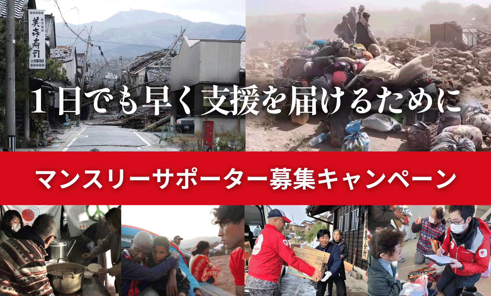今年1月1日に起きた能登半島地震では、AAR Japanは発生翌日に緊急支援チームを被災地に派遣し、炊き出しや物資配付などの支援活動を続けています。昨年は国内外で10の緊急支援に出動しました。こうした緊急支援を速やかに実施できるのは、「マンスリーサポーター」の皆さまからのご支援が大きな支えになっています。