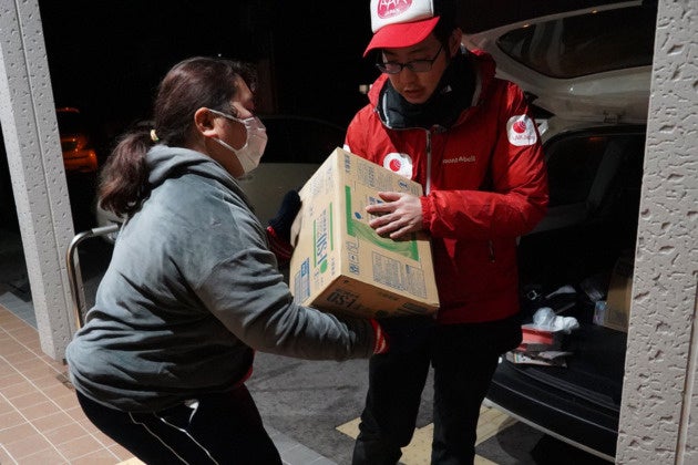 被災した障がい者施設の職員へ支援物資を手渡すAAR職員(石川県珠洲市、1月4日)