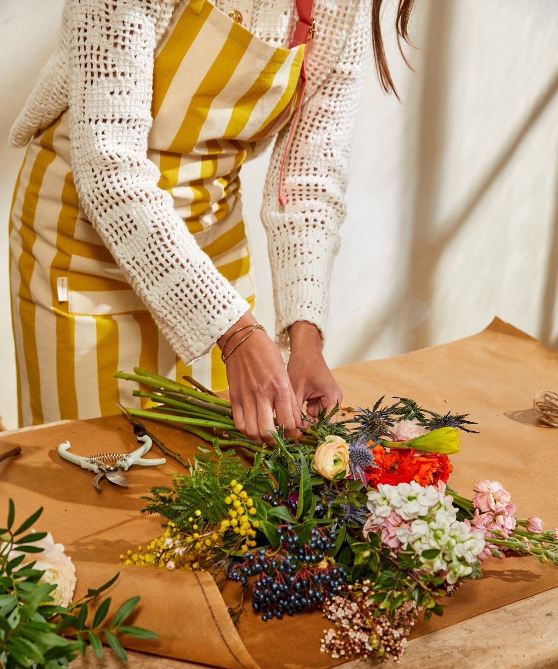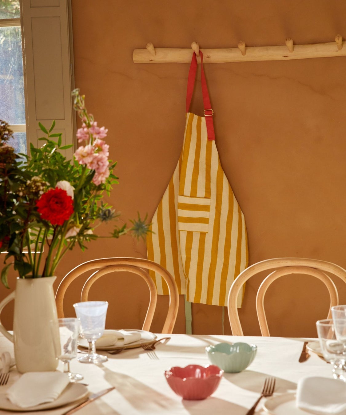 イエローxホワイトのストライプをベースに、オレンジとミントグリーンのストラップがユニークさを引き立てるエプロンは着るだけで気分をあげてくれる1着。テーブルにはフラワーデザインのペアボウルを並べて華やかさをプラス。