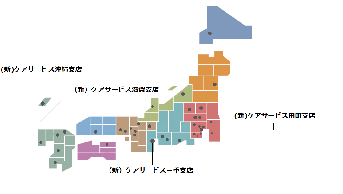 ● ケアサービス滋賀支店:〒525-0032 滋賀県草津市大路 1-10-1 第2南洋軒ビル 6F