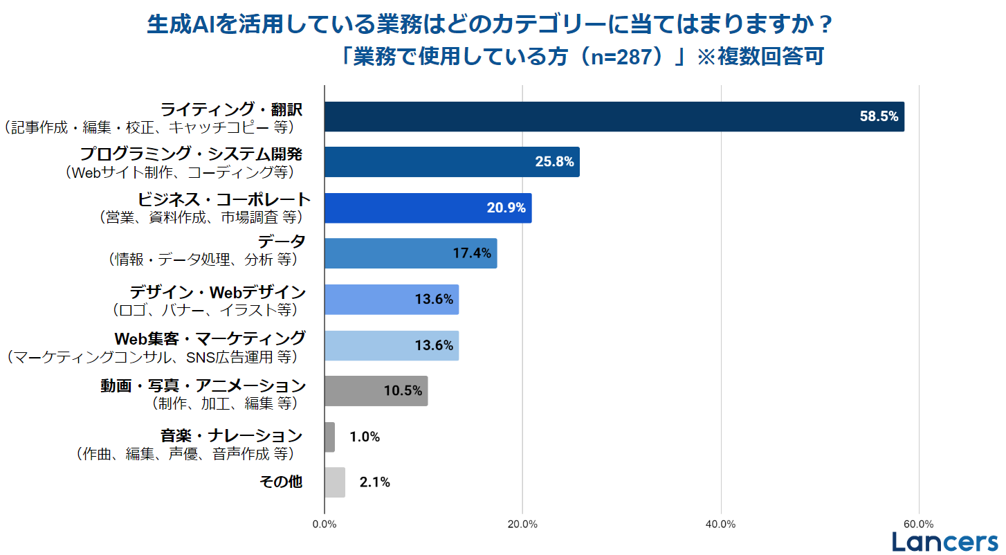 生成AIを使用している業務のカテゴリー上位3つは、「ライティング・翻訳」が最も多く58.5%、次いで「プログラミング・システム開発」が25.8%、「ビジネス・コーポレート」が20.9%