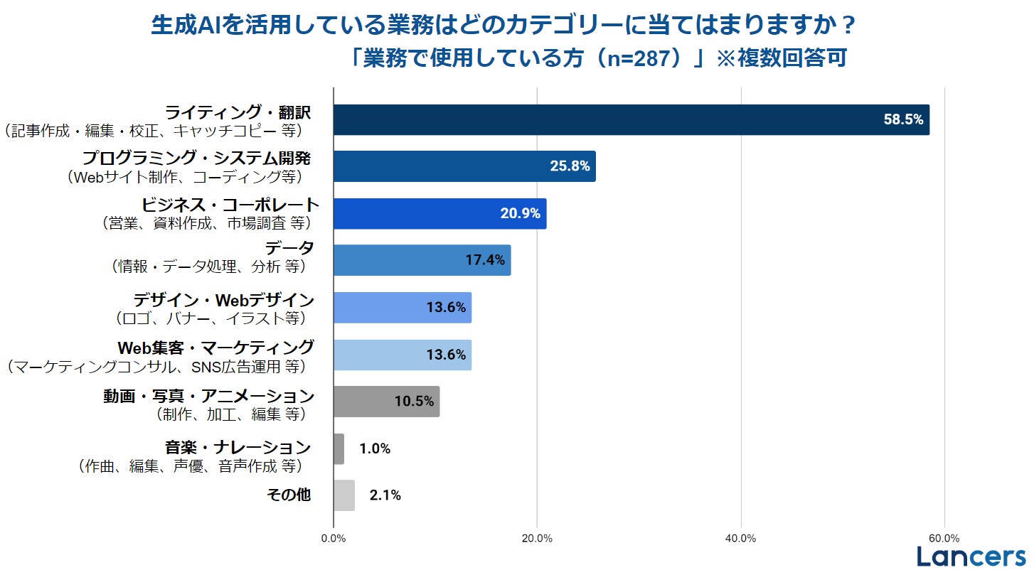 生成AIを使用している業務のカテゴリー上位3つは、「ライティング・翻訳」が最も多く58.5%、次いで「プログラミング・システム開発」が25.8%、「ビジネス・コーポレート」が20.9%であった。