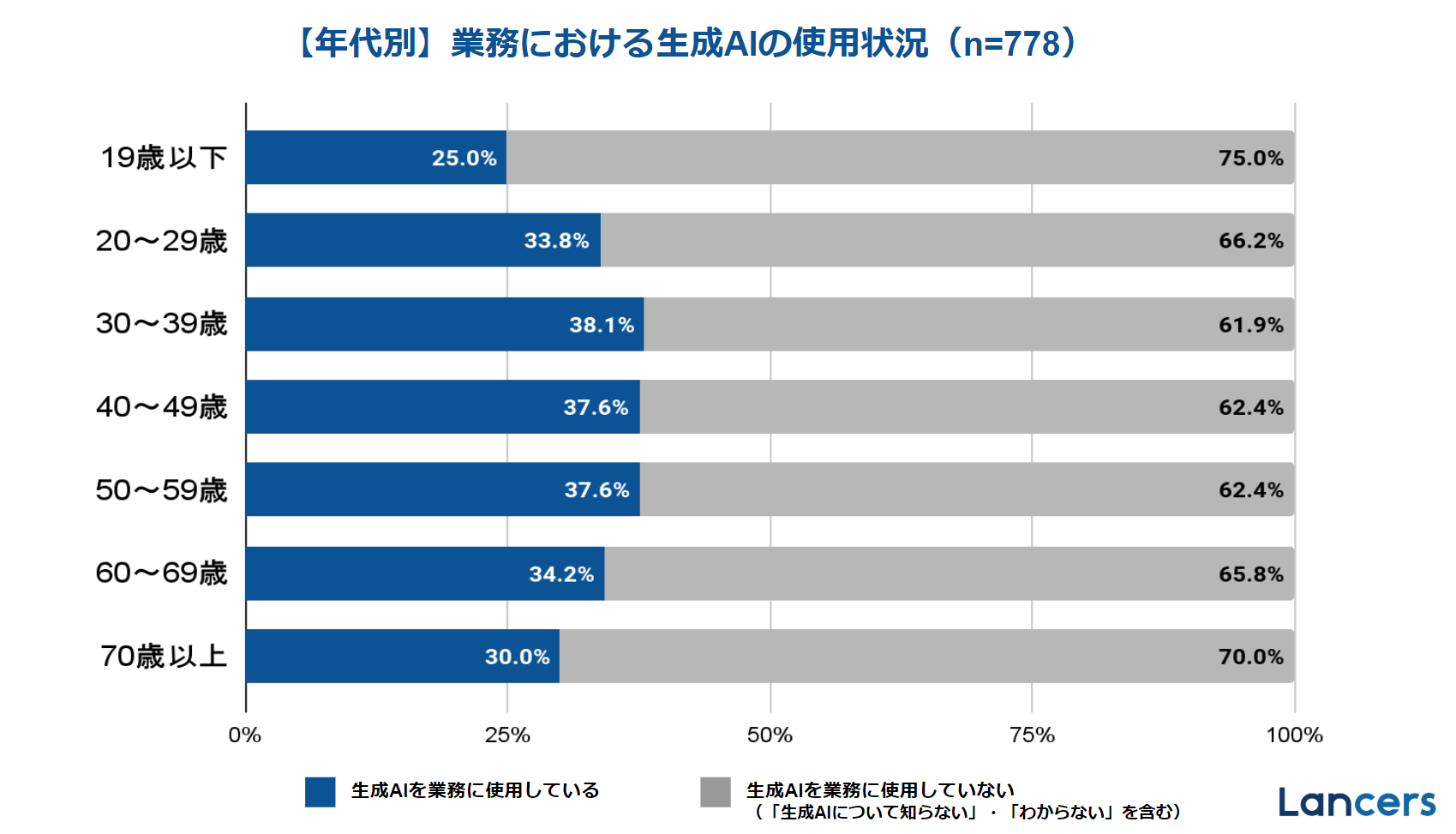 業務における生成AIの使用状況を年代別でみると、各年代で約25%~35%の使用率。年代別での使用率に大差はないものの、ビジネス現場において前線にいる30代~50代の使用率がやや高い。