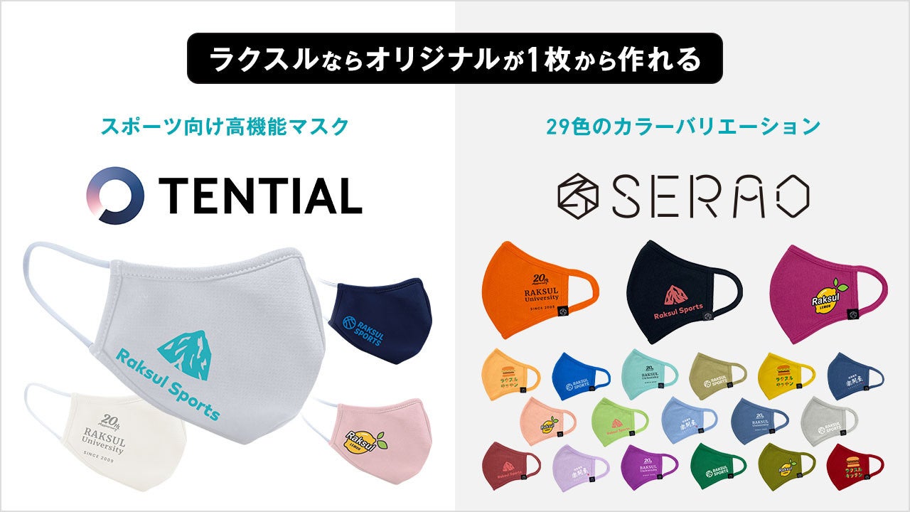 このたび、その人気を受けて商品バリエーション拡大を検討し、アスリートや経営者からの信頼も厚いスポーツウェア素材を使った高機能マスク「TENTIAL MASK」および29色のカラーバリエーションで企業のノベルティ制作ニーズや個人の趣向に応えるマスクを提供する「SERAOマスク」の取り扱いを決定いたしました。