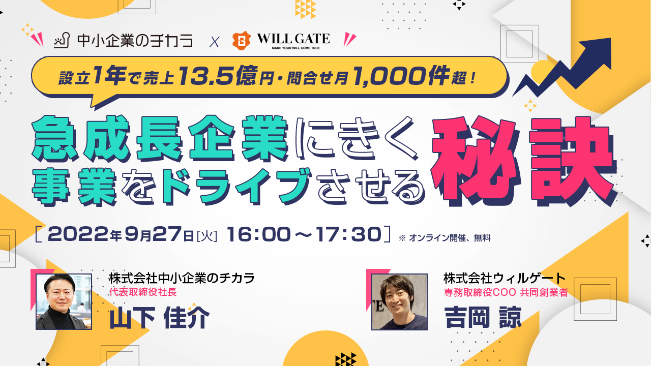 ウィルゲート、9月27日に中小企業のチカラ社と《急成長企業にきく事業をドライブさせる秘訣》をテーマにオンラインセミナーを開催