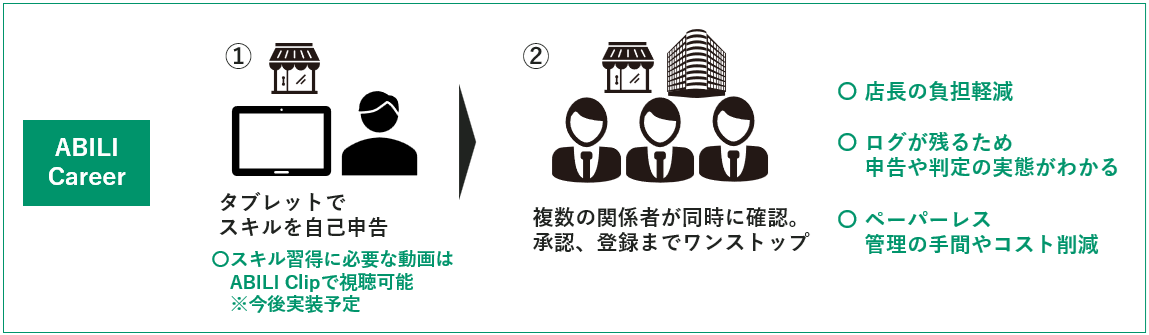 「ABILI Career」は、サービススキルマネジメントシステムとして、アルバイト・パートなどの非正規従業員も含めた全ての現場従業員のスキルチェックシステムをデジタル化し、適切な教育や評価の仕組みを構築します。企業ごとのワークフローに合わせたランクアップシステムの実装も可能で、スキルの可視化や評価、キャリアステップの最適化を実現します。