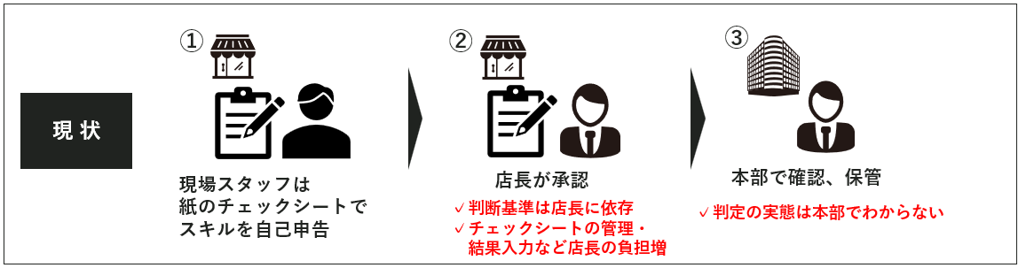 近年、大手企業を中心に、非正規社員のスキルアップやキャリア管理に取り組む企業が増えています。当社が外食・小売業を対象に実施した実態調査※によると、約8割が「スキルチェックの機会がある・今後導入の予定がある」と回答しています。一方、スキルチェックを実施している企業の約9割が「紙やExcelのチェックリストを利用して手作業で行っている」と回答しており、現場の負荷を上げる要因になっていることがうかがえます。