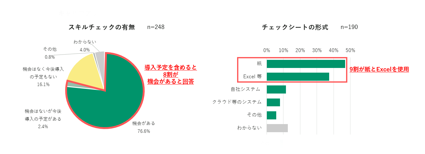 252社のうち8割が非正規社員を対象にしたスキルチェックの機会があると回答(左)しました。また、スキルチェックに使用する資料は「紙」、Excelなどの表計算ソフトが多数であることもわかりました。Excelで作ったスキルチェックシートを紙に印刷し、現場では紙で回答するような形式を考えると、合計で9割程度が当てはまると考えられます。専用システムを使用している企業は少数で、手作業が多く発生し現場の負荷となっている可能性が考えられます。