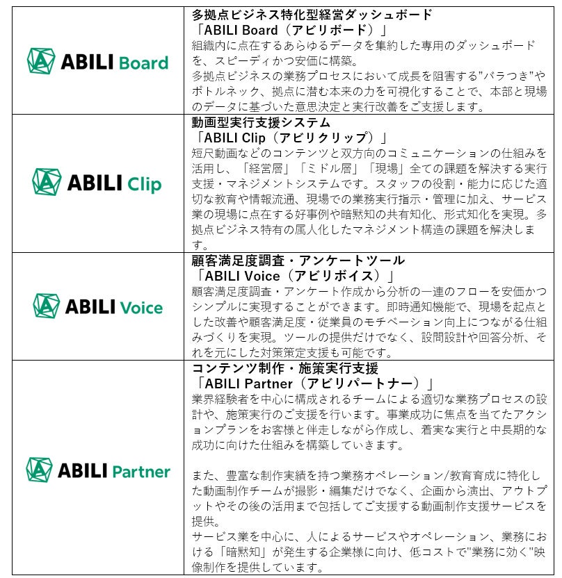 事業内容 :サービス業の潜在力を引き出す「ABILI(アビリ)」の開発・運営、及び経営コンサルティング