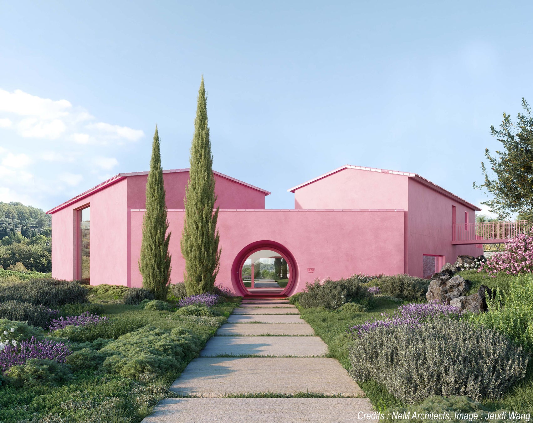 ランコムはその言葉と違わず、この穏やかで持続可能なプロジェクトを果断に実行していきます。プロジェクトで設計を手掛けたのはNeMエージェンシーに所属する2人の建築家、リュシー・ニネとティボー・マーカです。パッシブバイオクライマティックデザインがベースになっています。以前からあったドライストーンウォールは残し、伝統の工法で修復しました。新しい農業施設は自然の景観になじみ、ストーンウォールの外観とも調和する作りです。新しいローズハウスは従来のプロヴァンス風住居の大きさと建築学的特徴を踏襲しながら改修しました。グラース地域の遺産や技術を忠実に取り入れた色や素材を使いながら現代的外観に仕上げています。主たる建物の改築については被覆材や屋根、木工品など外装に用いる材料はすべてピンクで統一し、色の数を抑えることによって全体がまとまった印象を与えます。ピンクはこの土地の色の一つです。この地域に生育する花や植物に自然に存在し、グラースの住宅の正面にもしばしば用いられます。そしてランコムのイメージと共鳴する色でもあります。