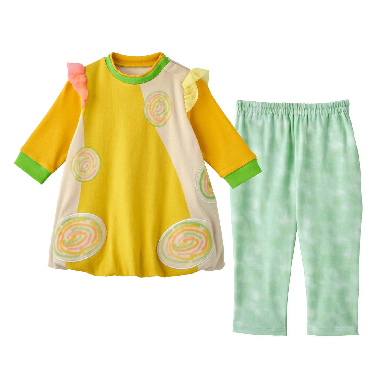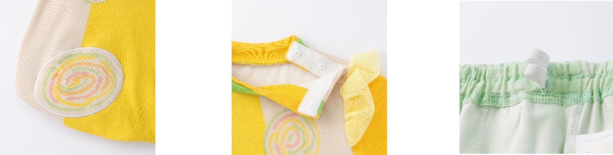 今回発売する新商品「<おうちゃん>になれる!トップス&ボトムセット」は、NHKの人気乳幼児向け番組「いないいないばあっ!」に登場するお姉さんの<おうちゃん>の衣装をイメージした上下セットのウェアです。元気いっぱいのビタミンカラーの配色や細かなデザインなど、おうちゃんとお揃い感を大切にしつつ、ご家庭でお子さんが楽しく着られるように着心地の良さと扱いやすさにもこだわりました。